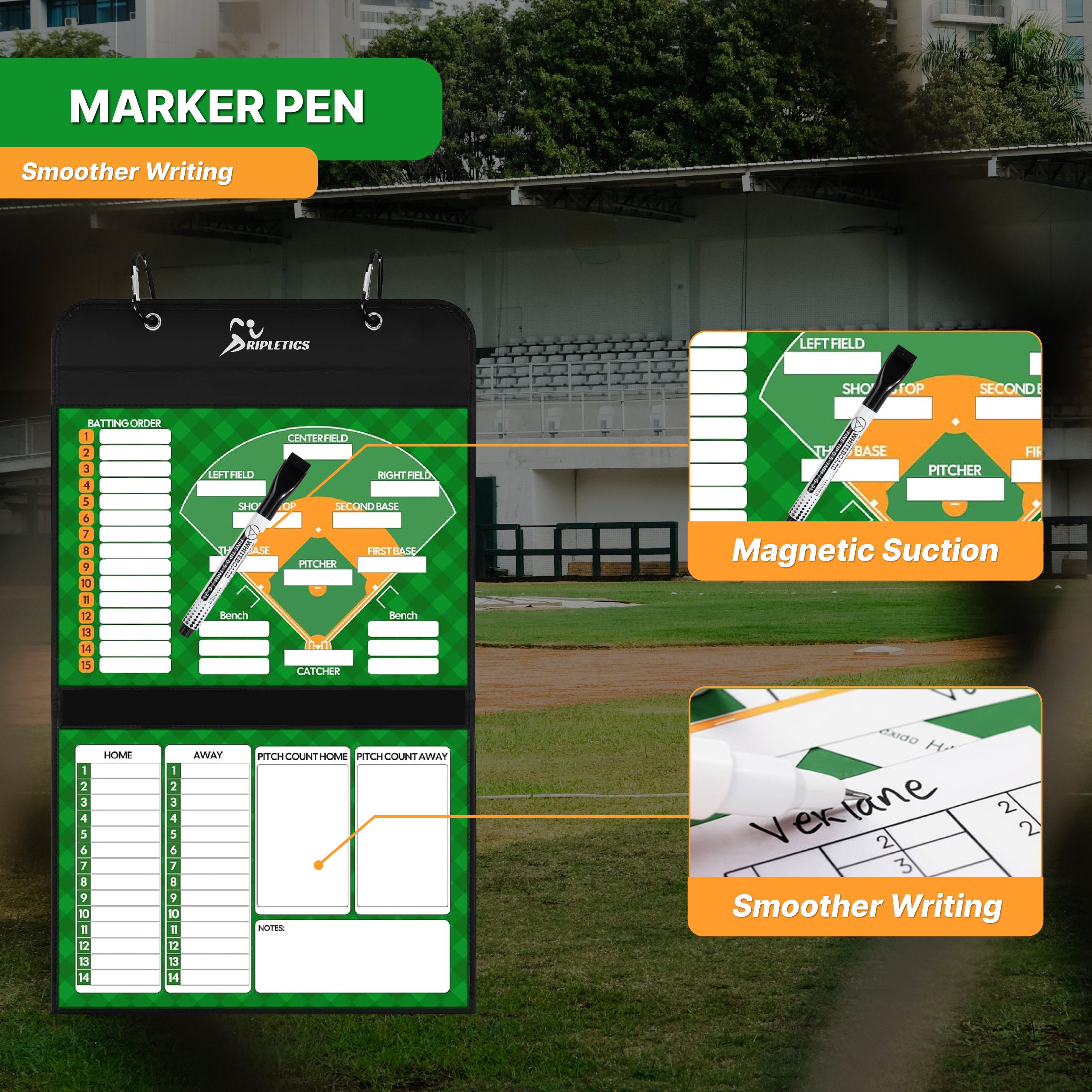 - What you’ll get: Each set of the baseball lineup board for the dugout includes carefully selected accessories: 1 magnetic baseball lineup board, 40 magnetic lineup cards, 1 black marker, 1 red marker, 1 whiteboard eraser, 4 hooks, and 1 organizer bag.